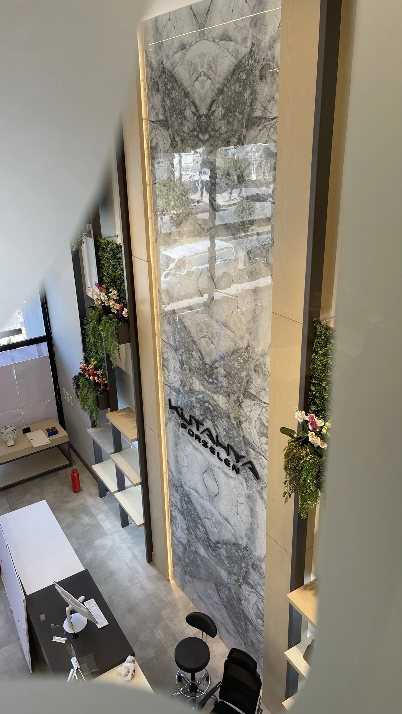 Warm Materiality: Subtle wood accents in the flooring and reception area add warmth, contrasting with the cool, smooth finish of the ceramics to create a balanced, welcoming environment.
